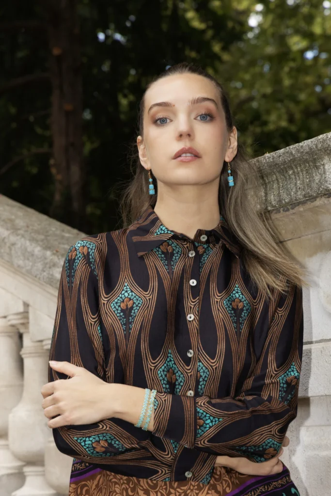 Cette blouse en viscose légère séduit par son imprimé délicat mis en valeur sur un fond vert profond. Sa matière fluide et douce assure un confort optimal, tandis que sa coupe féminine s’adapte à toutes les silhouettes. Fabriquée en Italie, elle incarne un style à la fois chic et facile à porter, que ce soit au bureau ou en soirée.