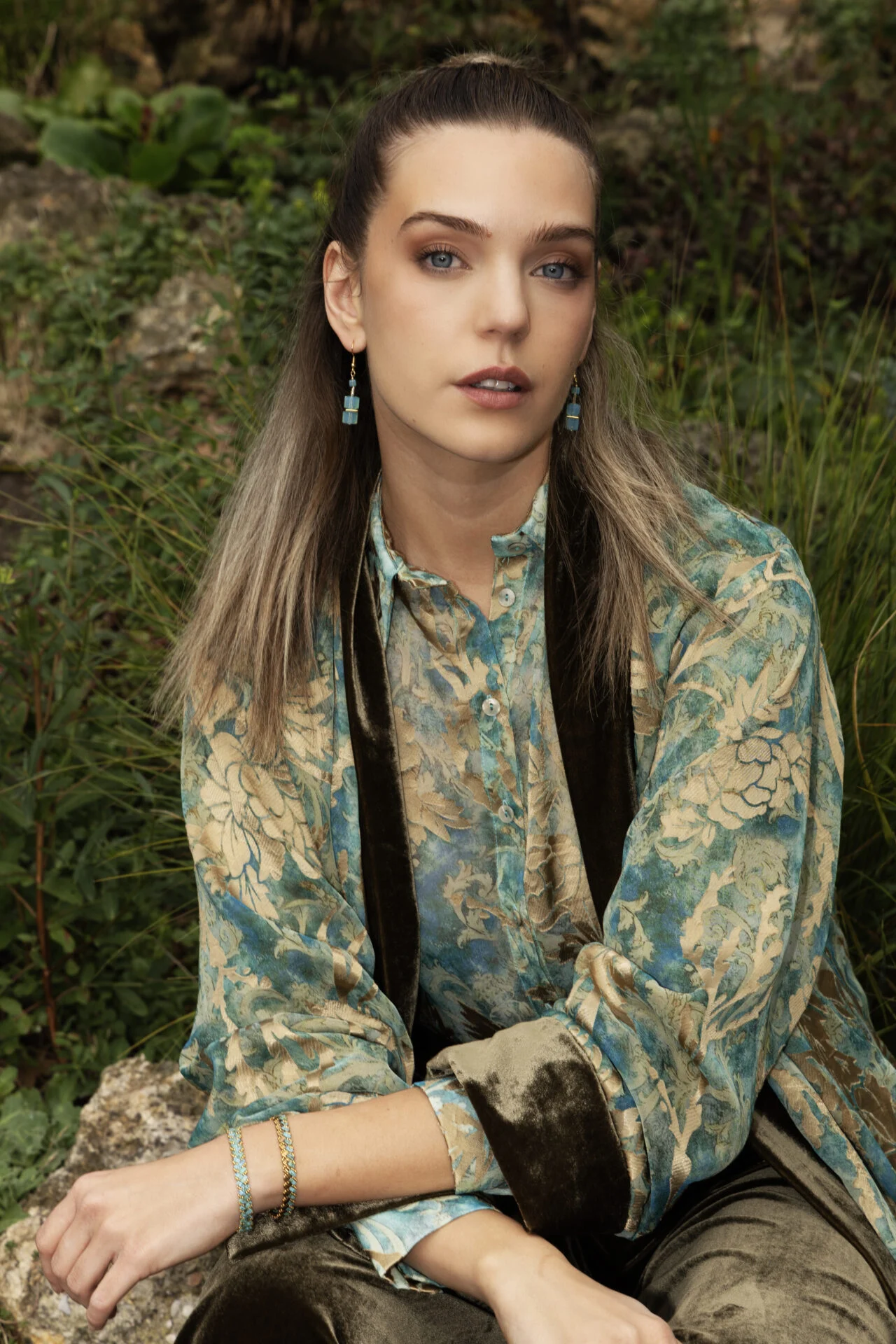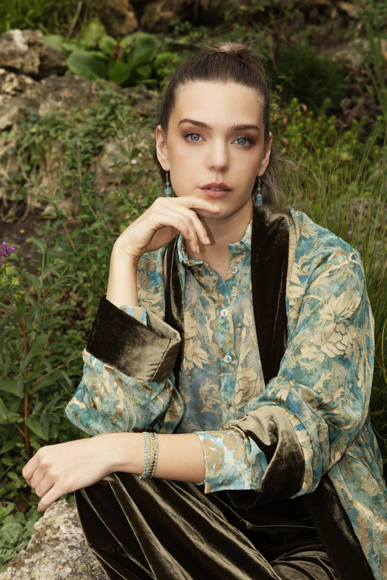 A poetic kimono in soft, natural tones. This long, flowing piece features a delicate floral print in shades of turquoise, aqua, and beige, highlighted with deep khaki velvet finishes on the collar and cuffs. Elegant and bohemian, it’s perfect for elevating everyday looks or adding sophistication to a dressier outfit.