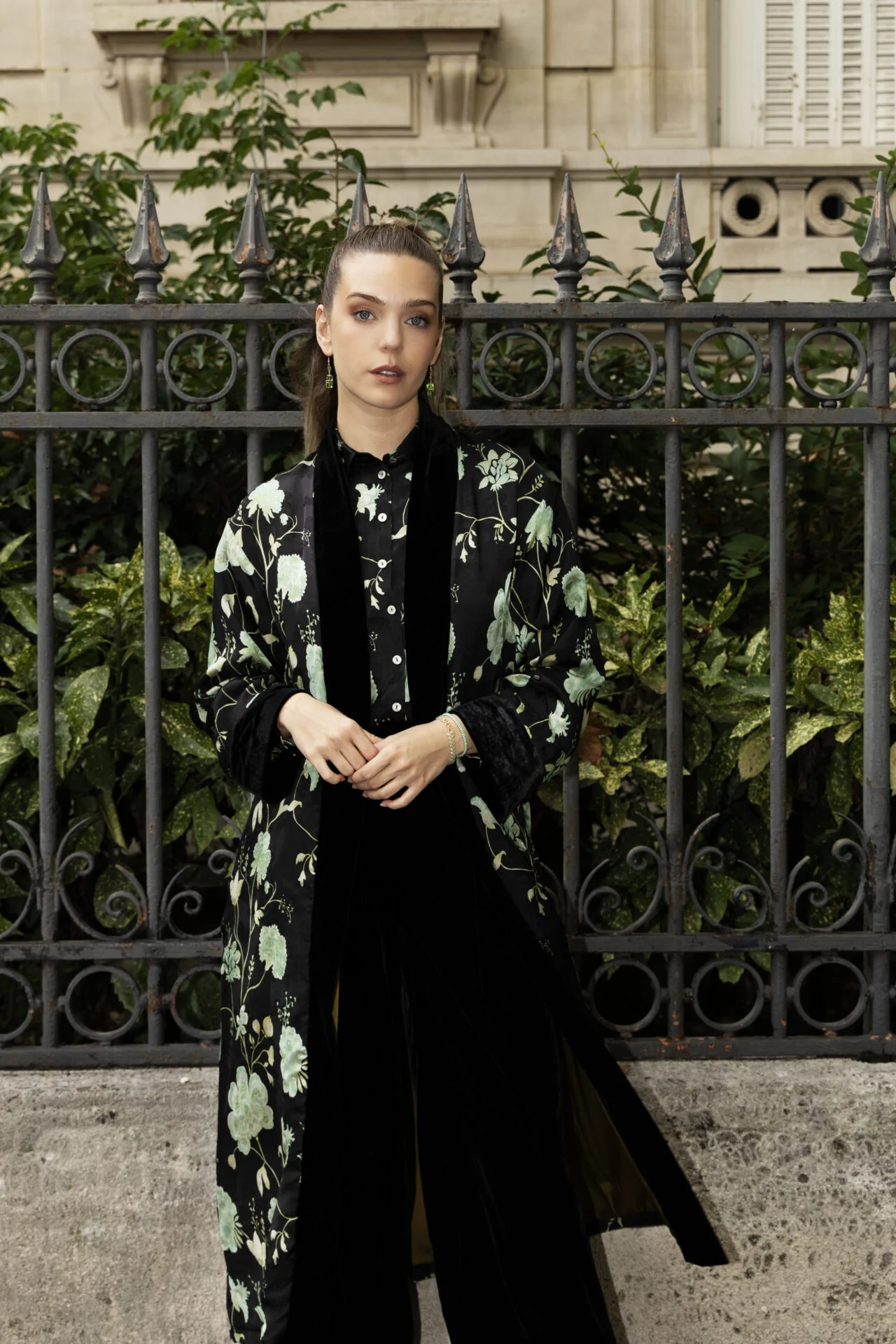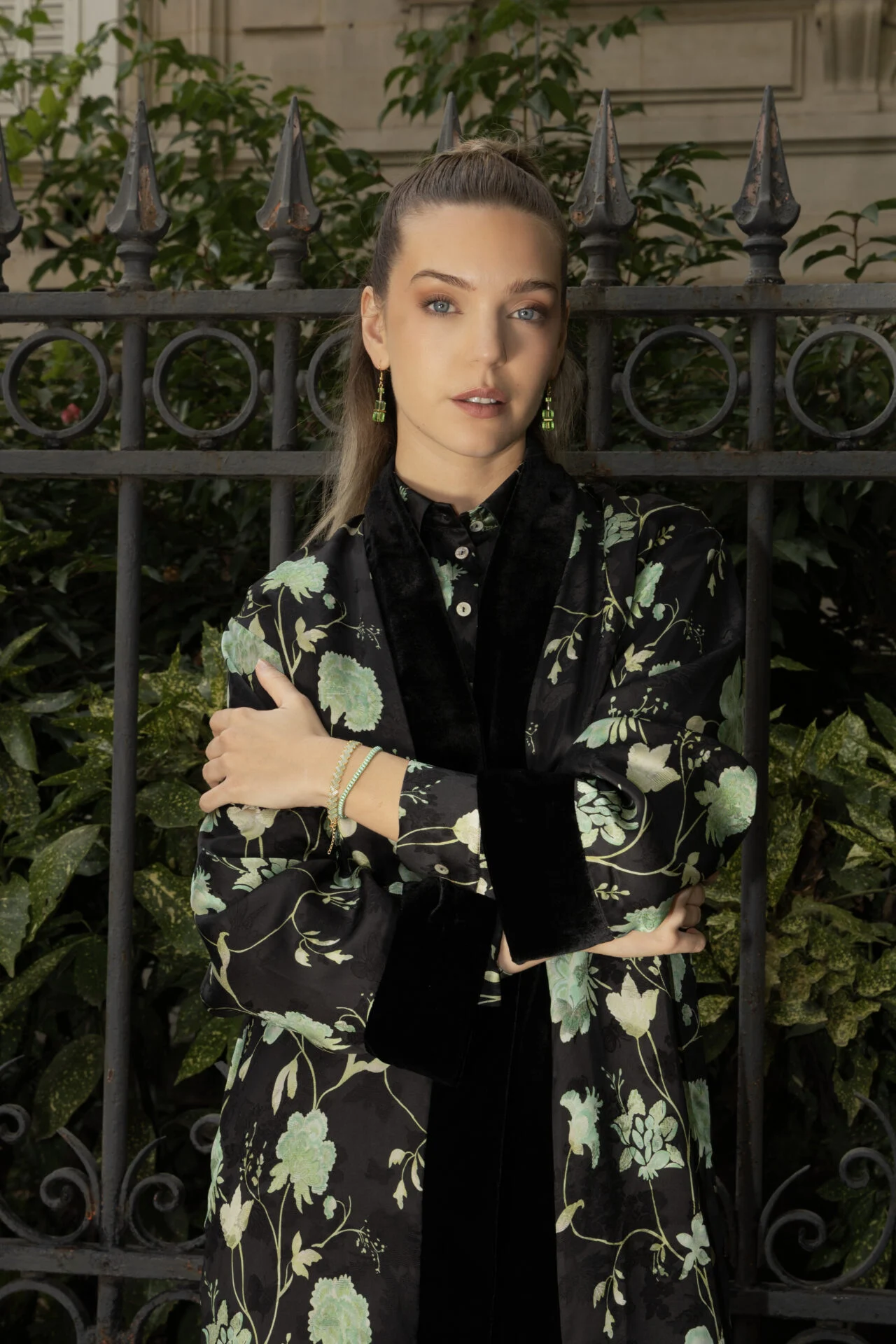 Ce kimono d’exception incarne l’élégance française  contemporaine. Confectionné en satin fluide, il séduit par son imprimé floral délicat dans des tons vert sauge et ivoire sur fond noir profond. Sa coupe ample et légère s’enrichit d’un revers en velours noir et d’une doublure contrastante couleur moutarde, ajoutant profondeur et sophistication au vêtement.