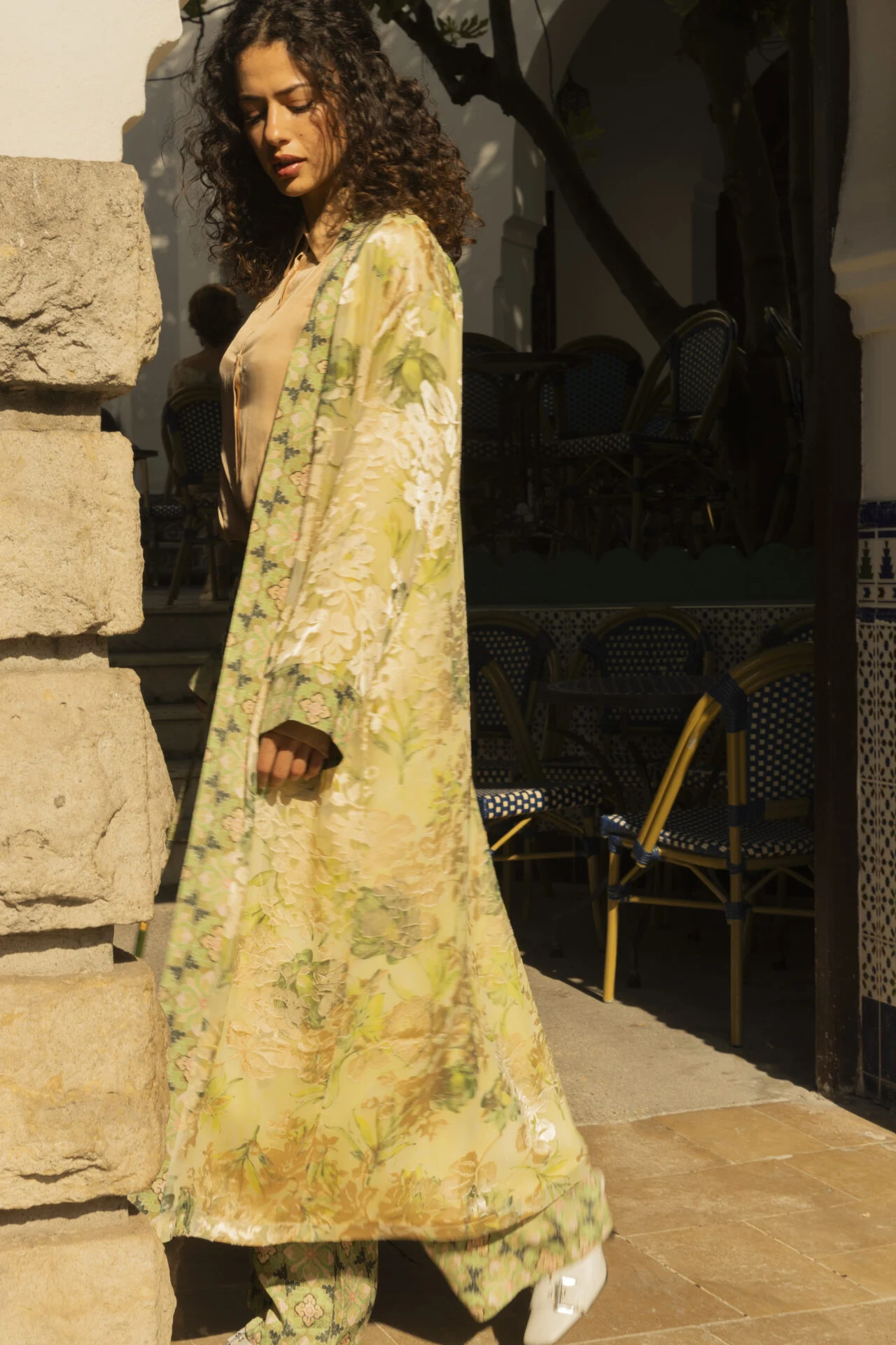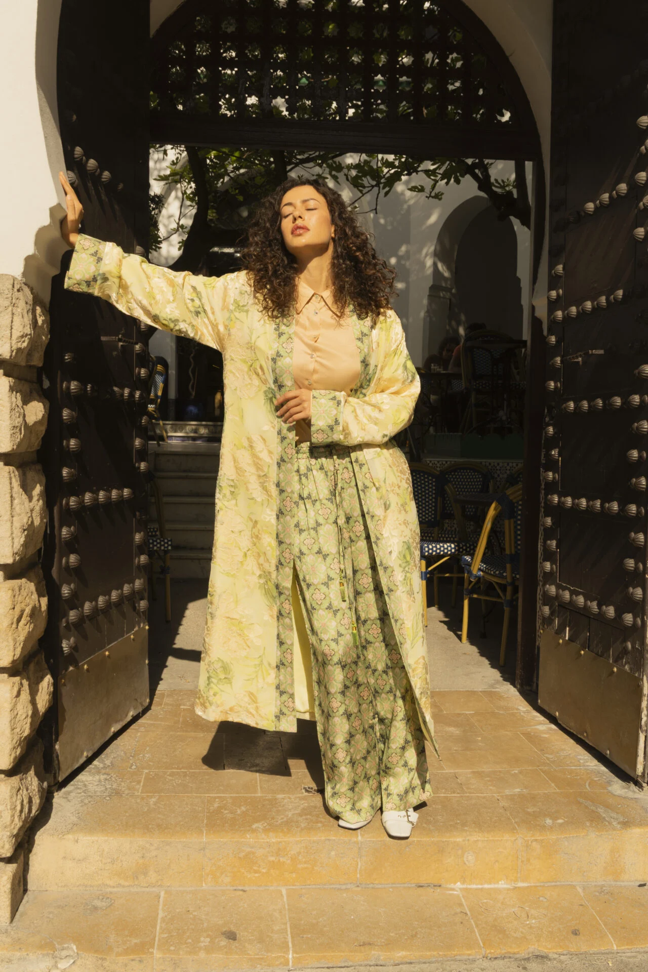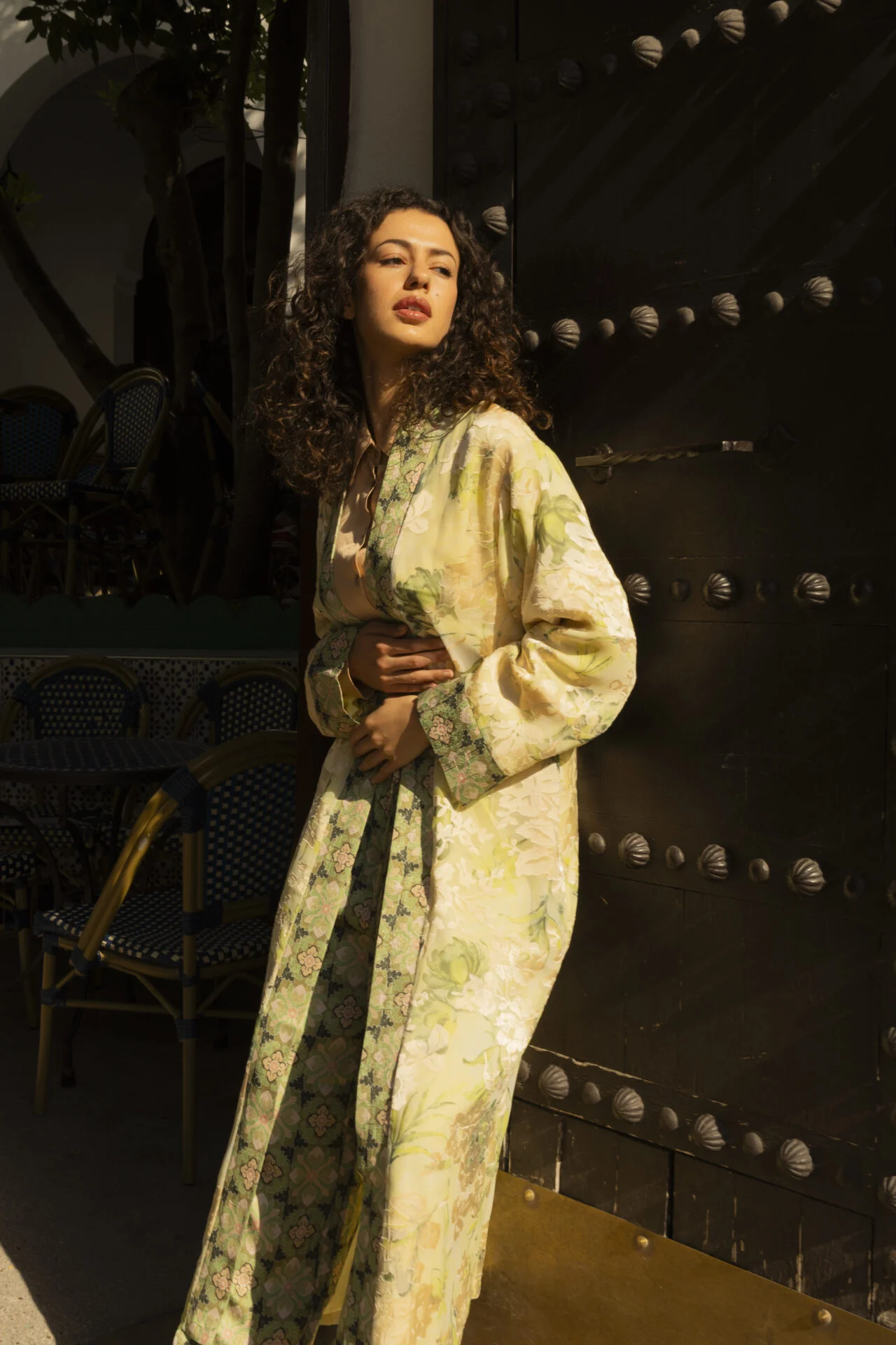 Kimono fluide d’inspiration botanique, sublimé par de délicates nuances de vert et des reflets lumineux. Son tissu léger et légèrement translucide enveloppe la silhouette avec douceur, offrant un mouvement naturel et une élégance subtile.