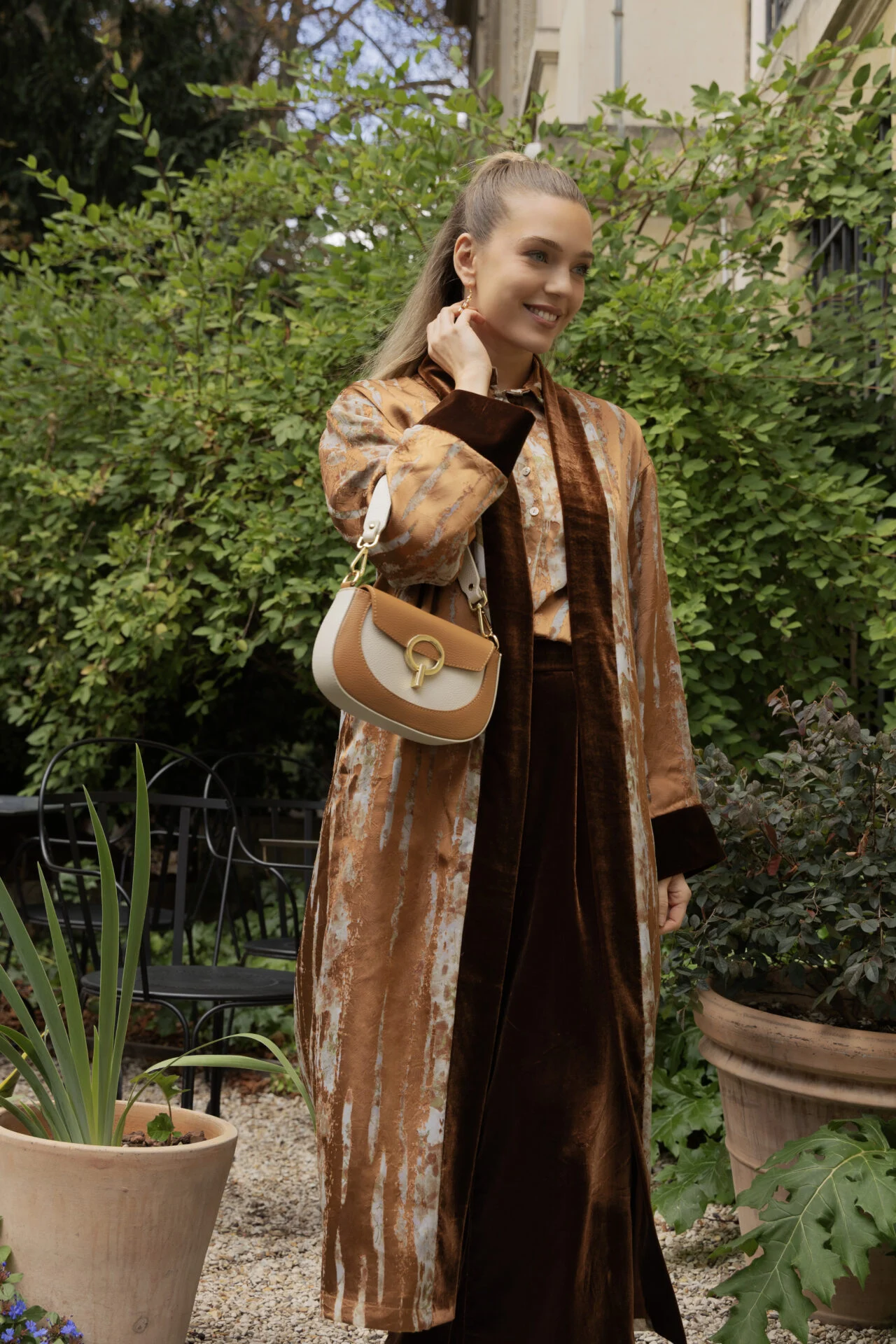 Elegant and fluid, this long velvet kimono in caramel and chocolate tones adds a refined touch to any outfit. The solid velvet collar and cuffs enhance its chic silhouette. Perfect for both dressy and casual looks.