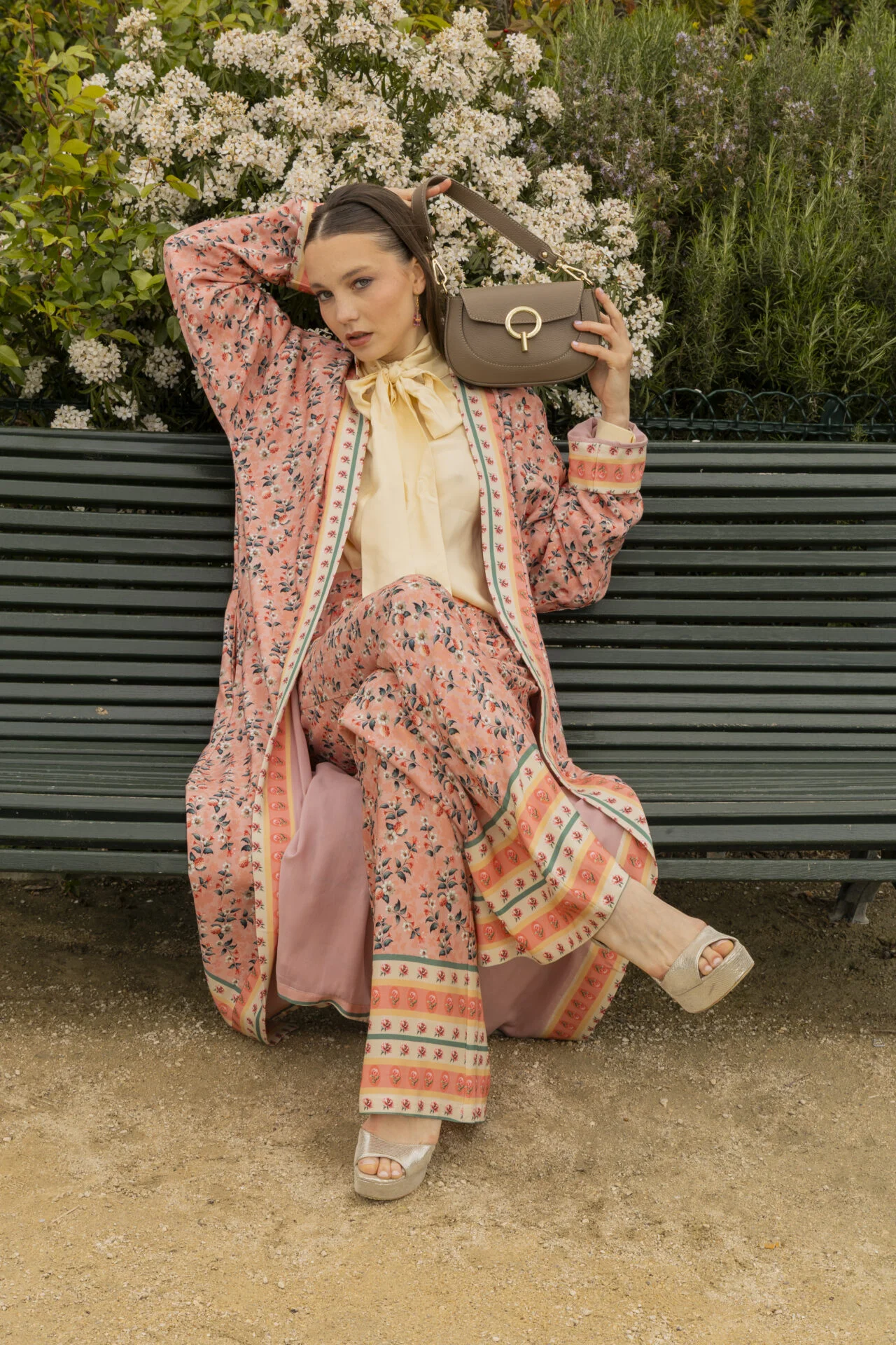Pantalon fluide à imprimé floral, rehaussé d’une bordure délicatement contrastée en bas de jambe. Sa coupe ample accompagne le mouvement avec élégance et légèreté.